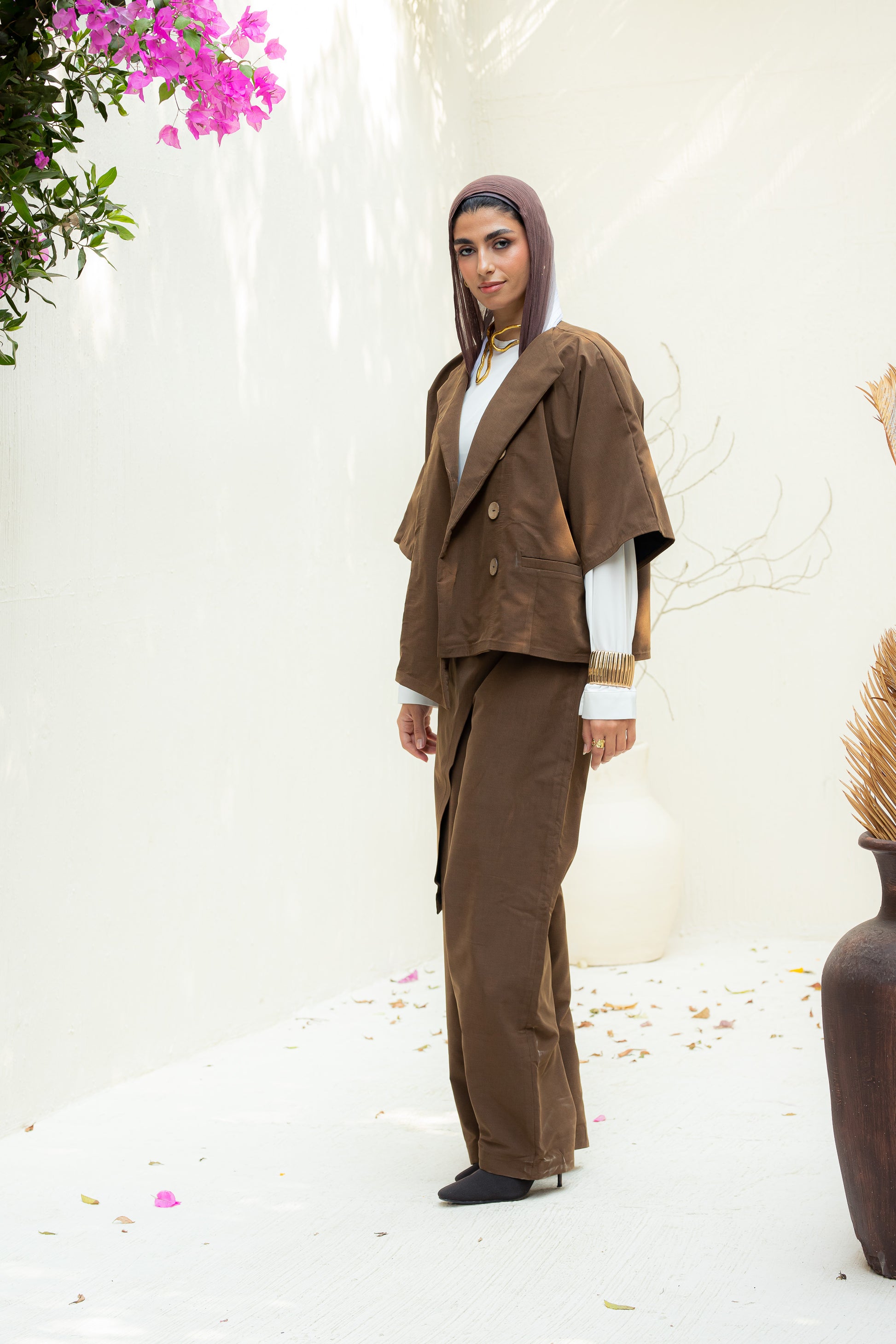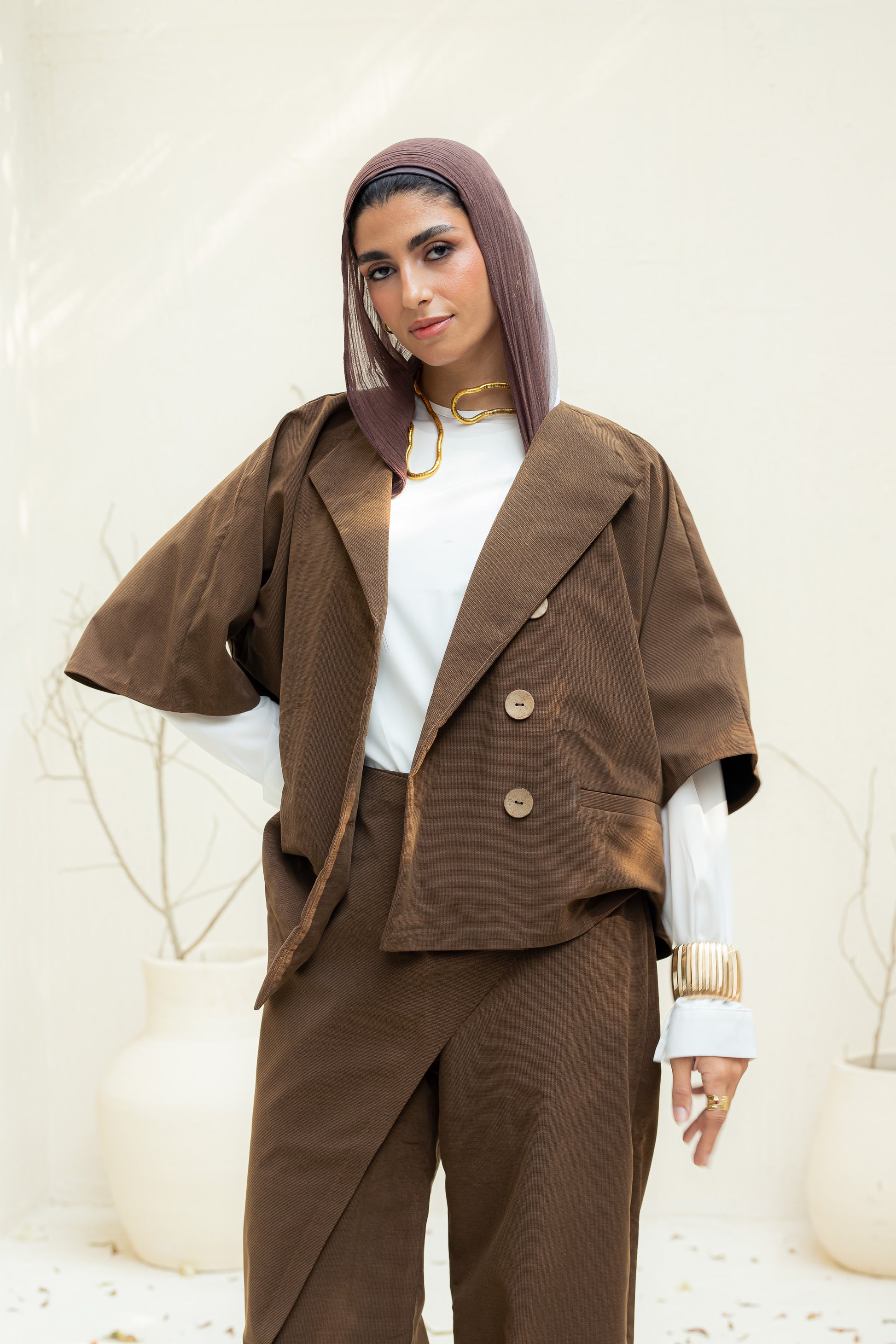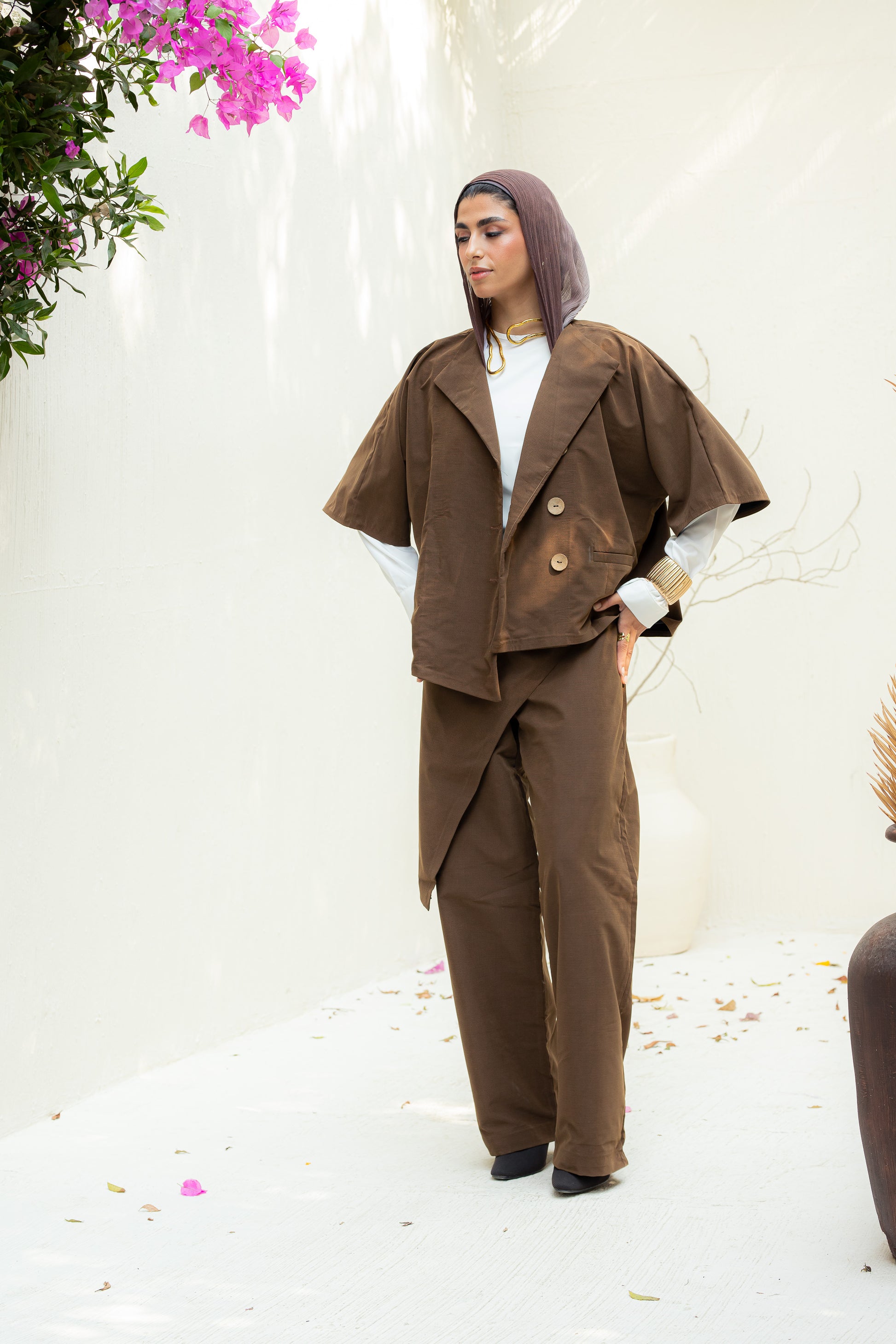 This rich brown set features a cropped jacket and half-overlap pants that redefine tailored minimalism. Designed with clean lines and subtle edge, it blends comfort and confidence in every detail. Perfect for elevating your everyday look or making a bold statement with quiet elegance.