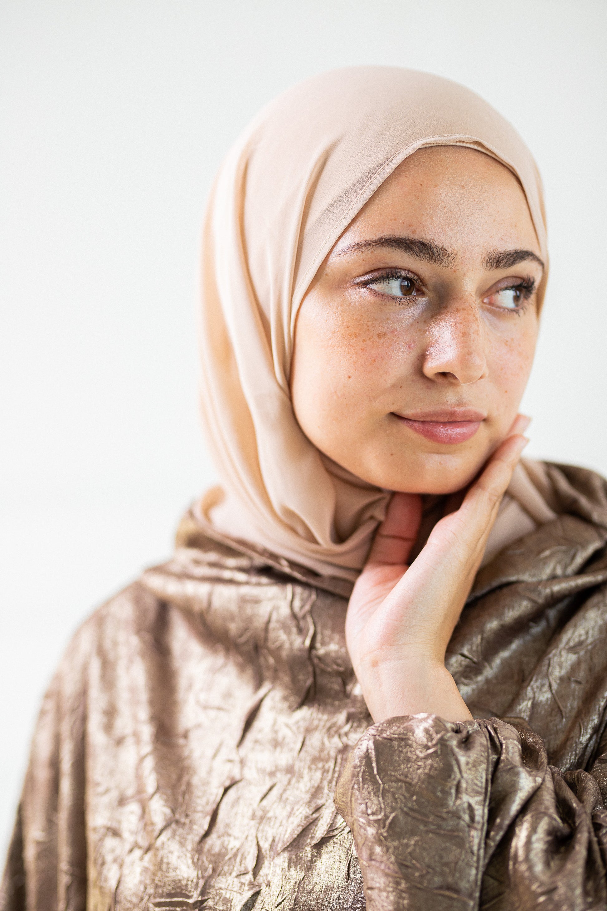 Meet your new go-to: a lightweight slip-on chiffon scarf that’s quick to wear, easy to style, and finished with a subtle twist of grace. Just slip it on and go — no pins, no fuss, all flow.