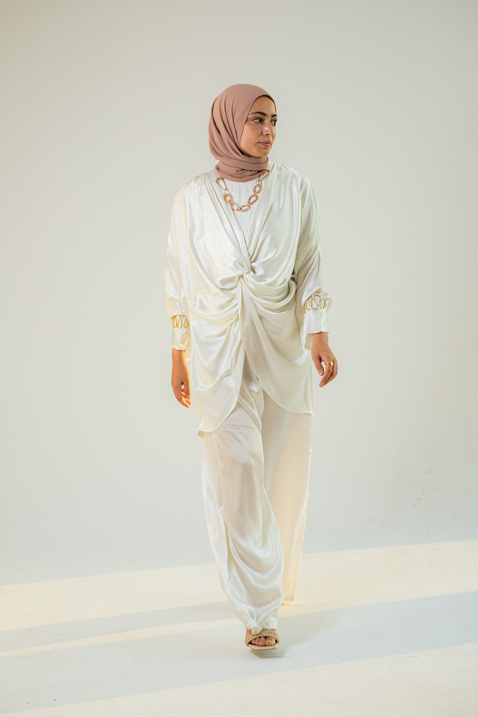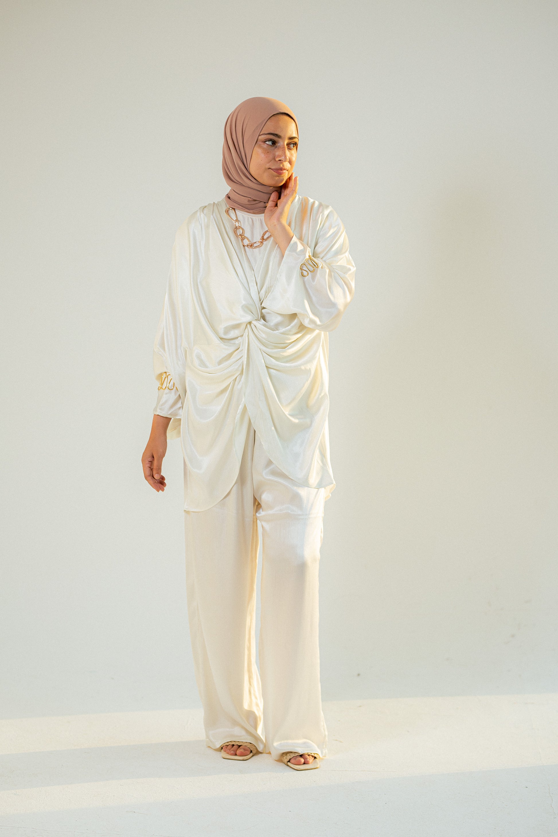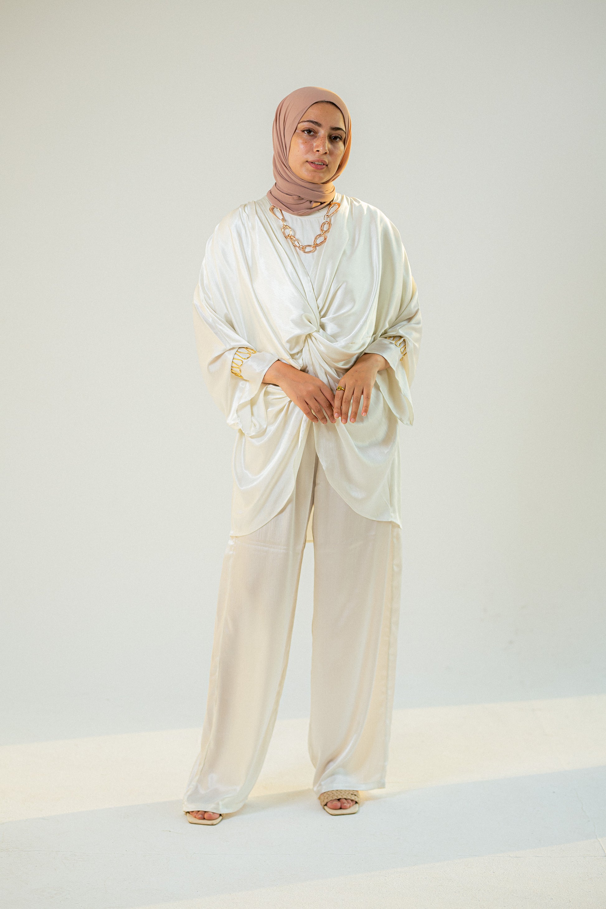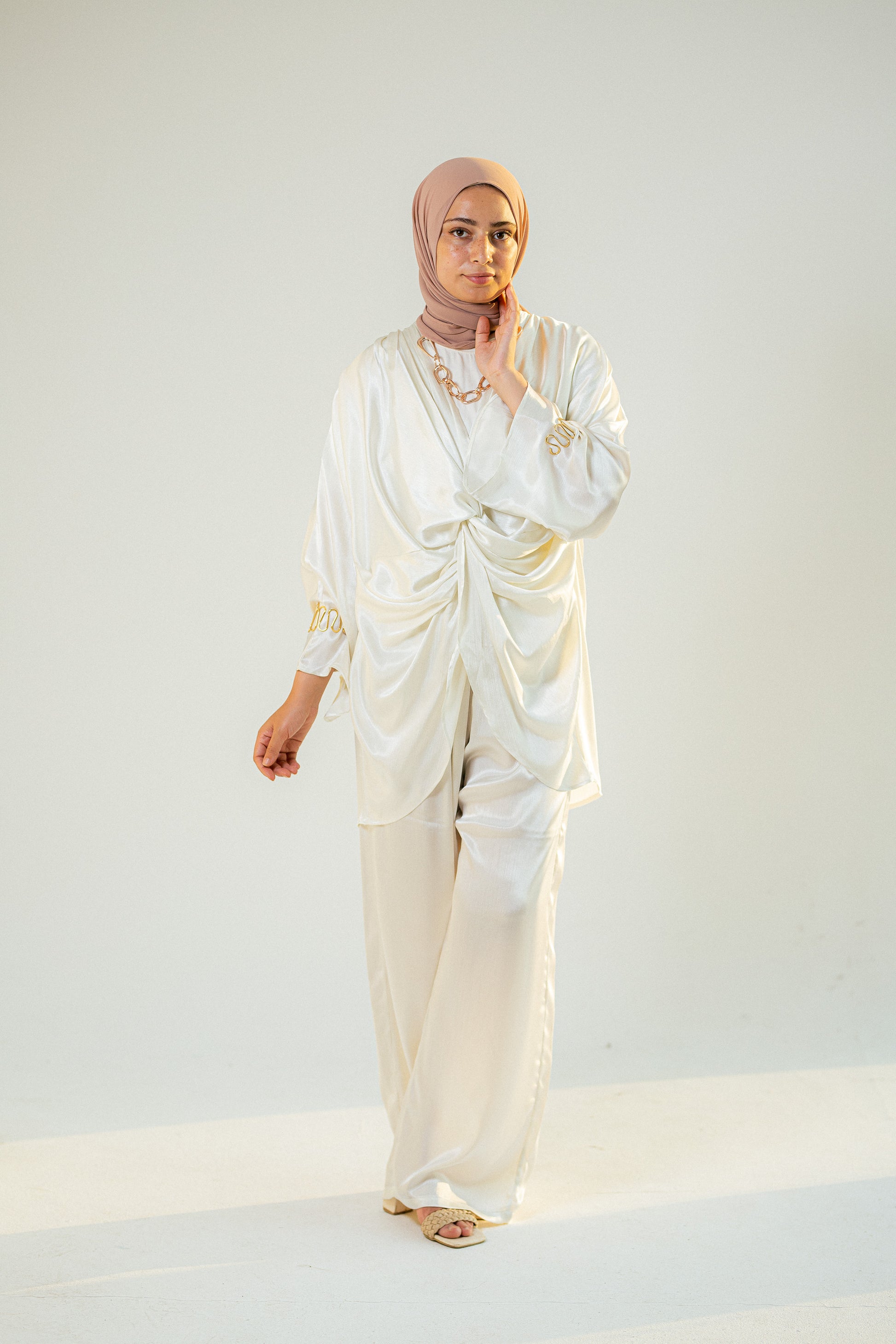 Here’s a chic and polished name + description for your satin set (knot top + wide leg pants) that will work beautifully on your website:
