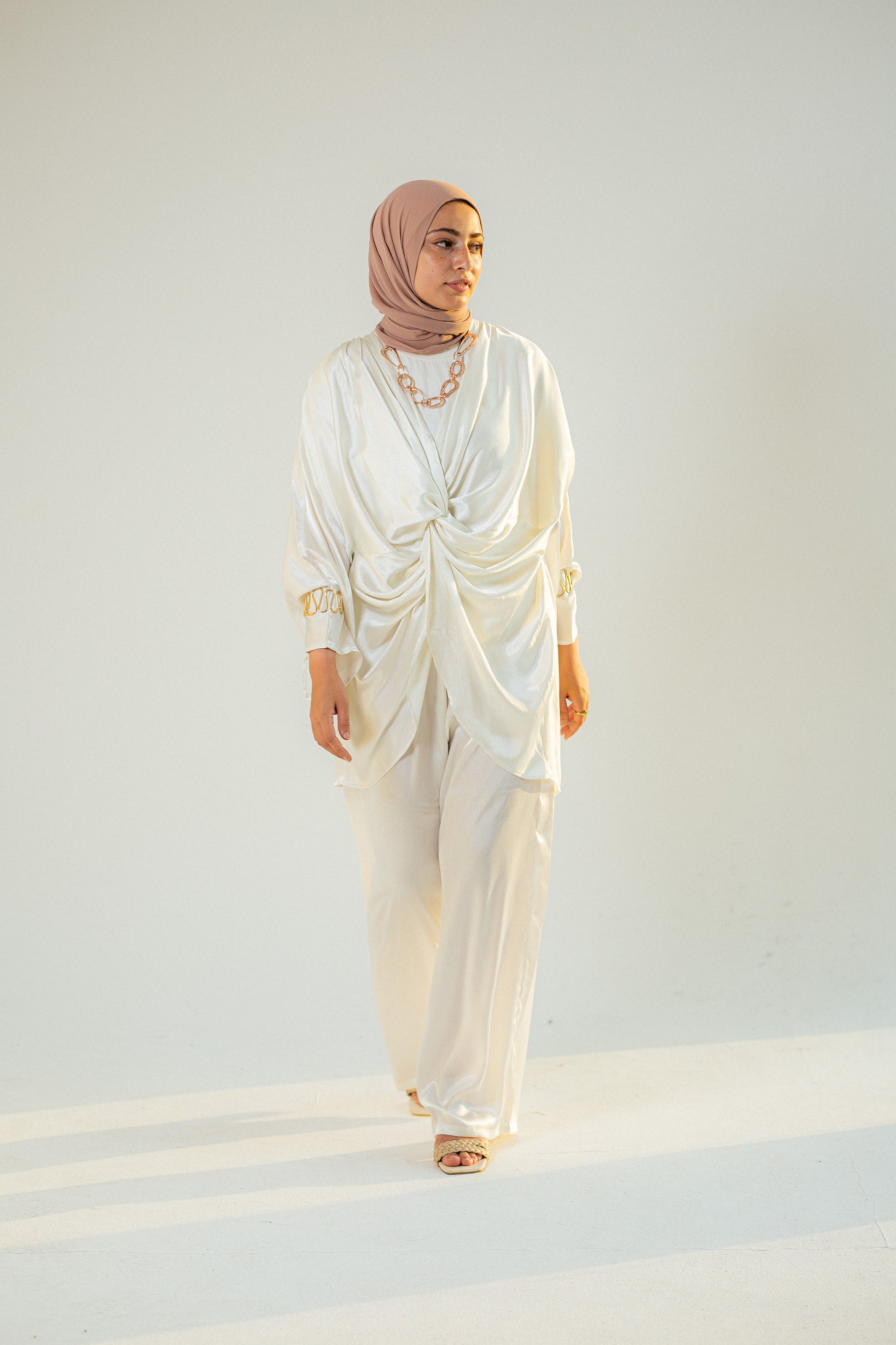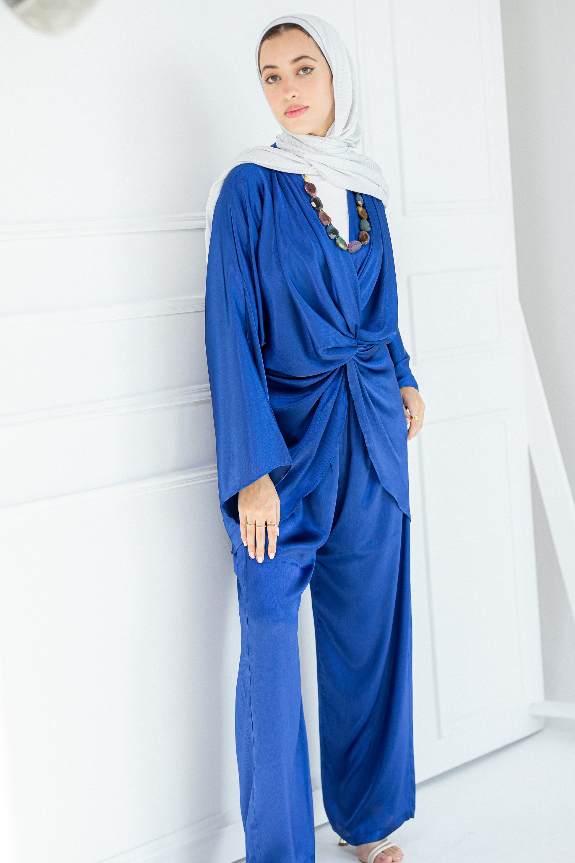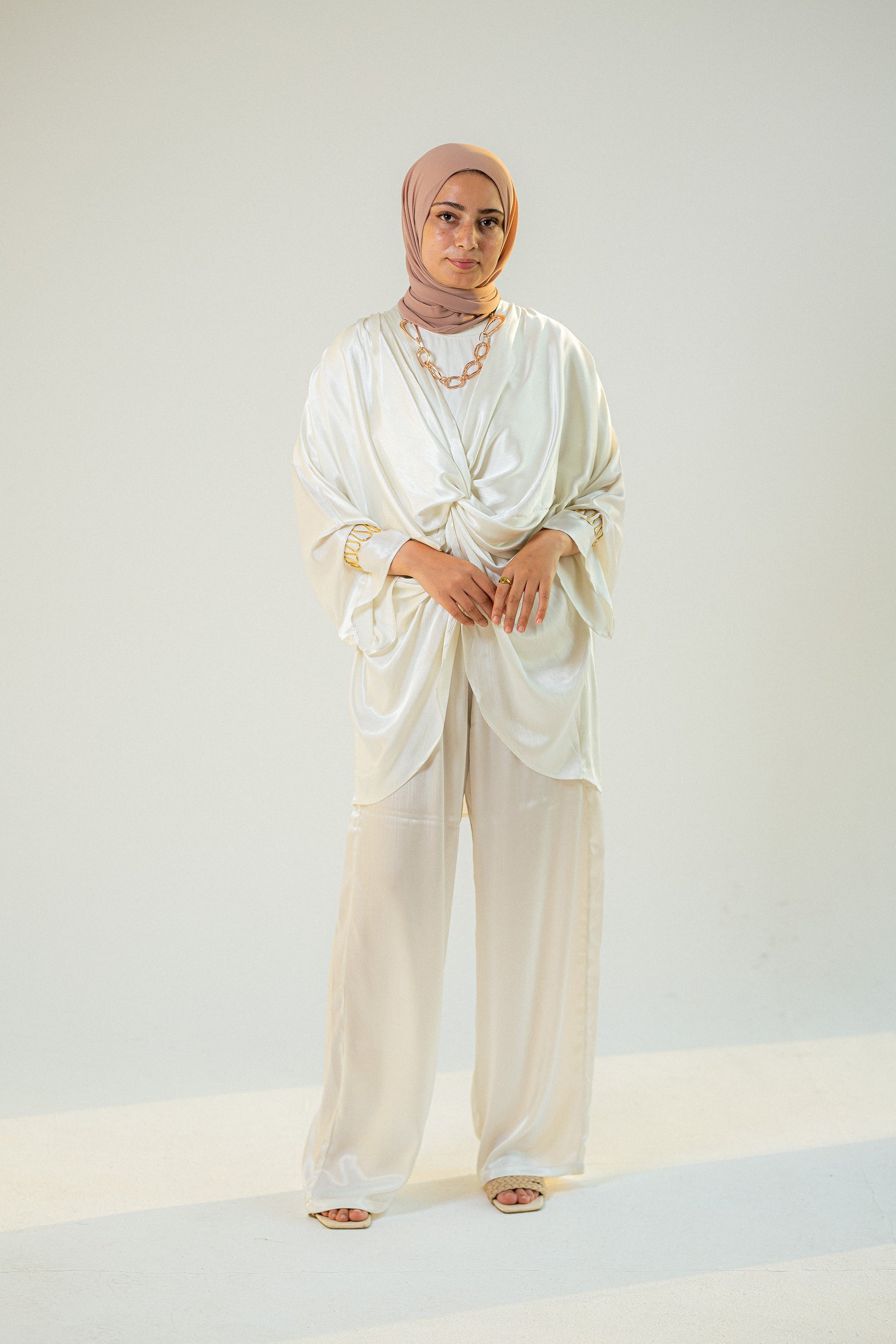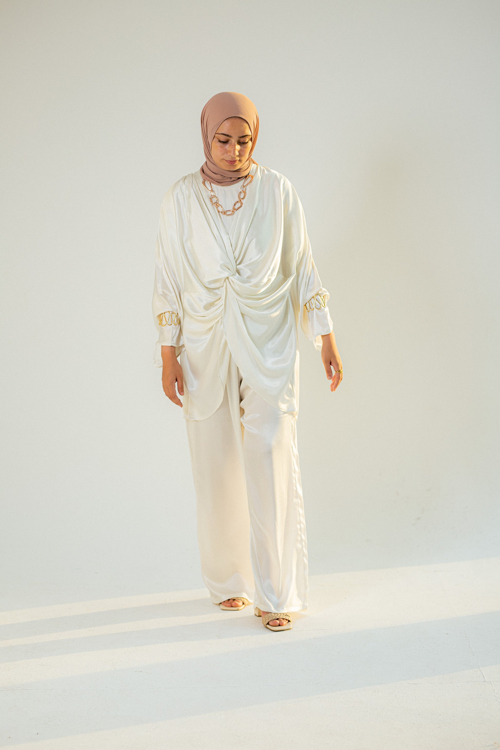 Here’s a chic and polished name + description for your satin set (knot top + wide leg pants) that will work beautifully on your website: