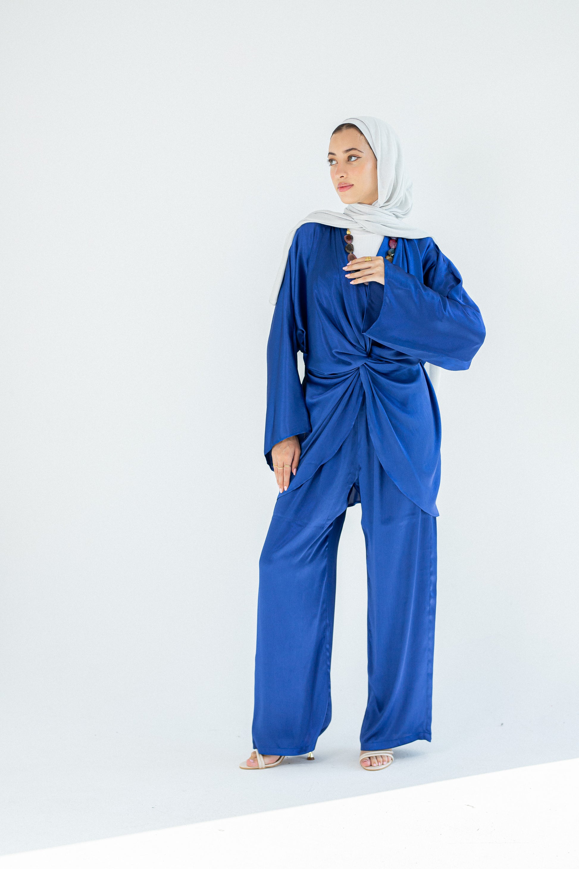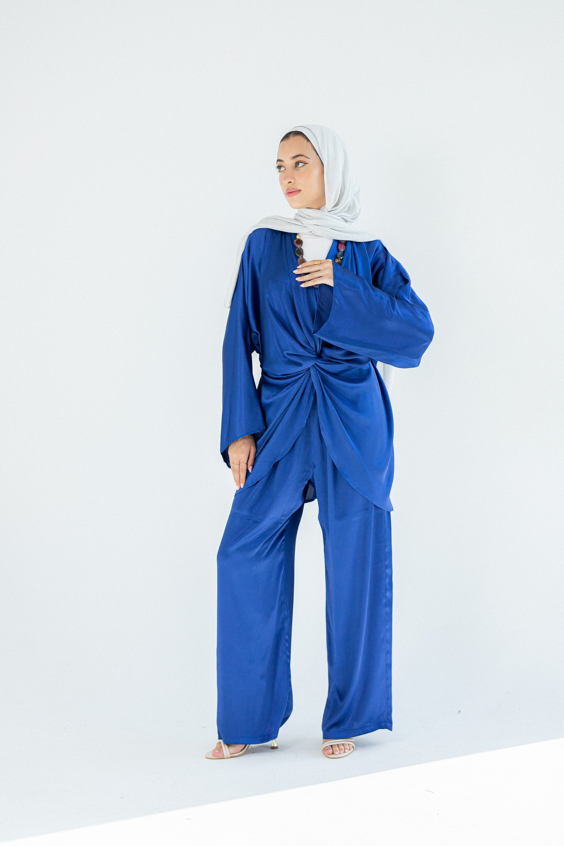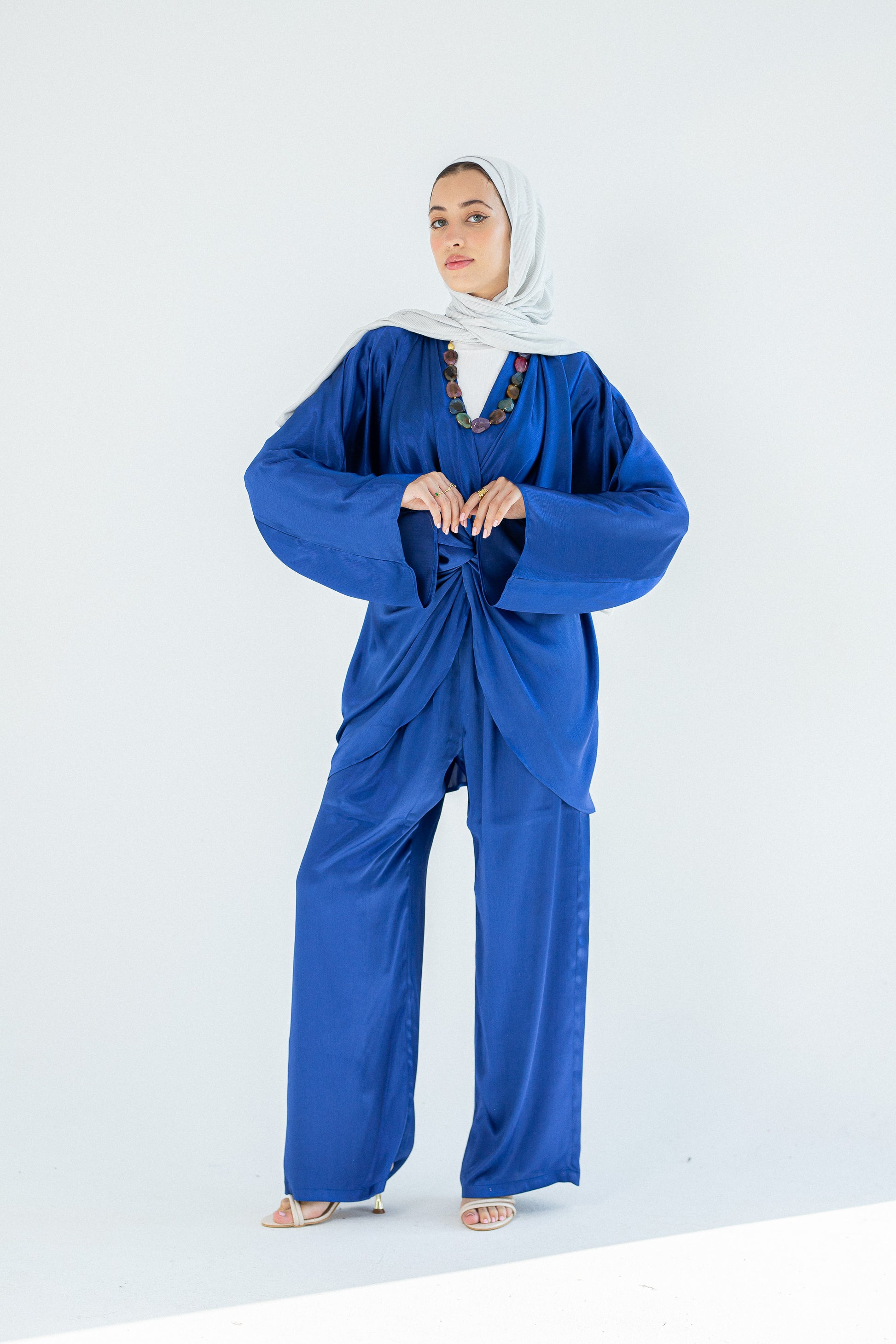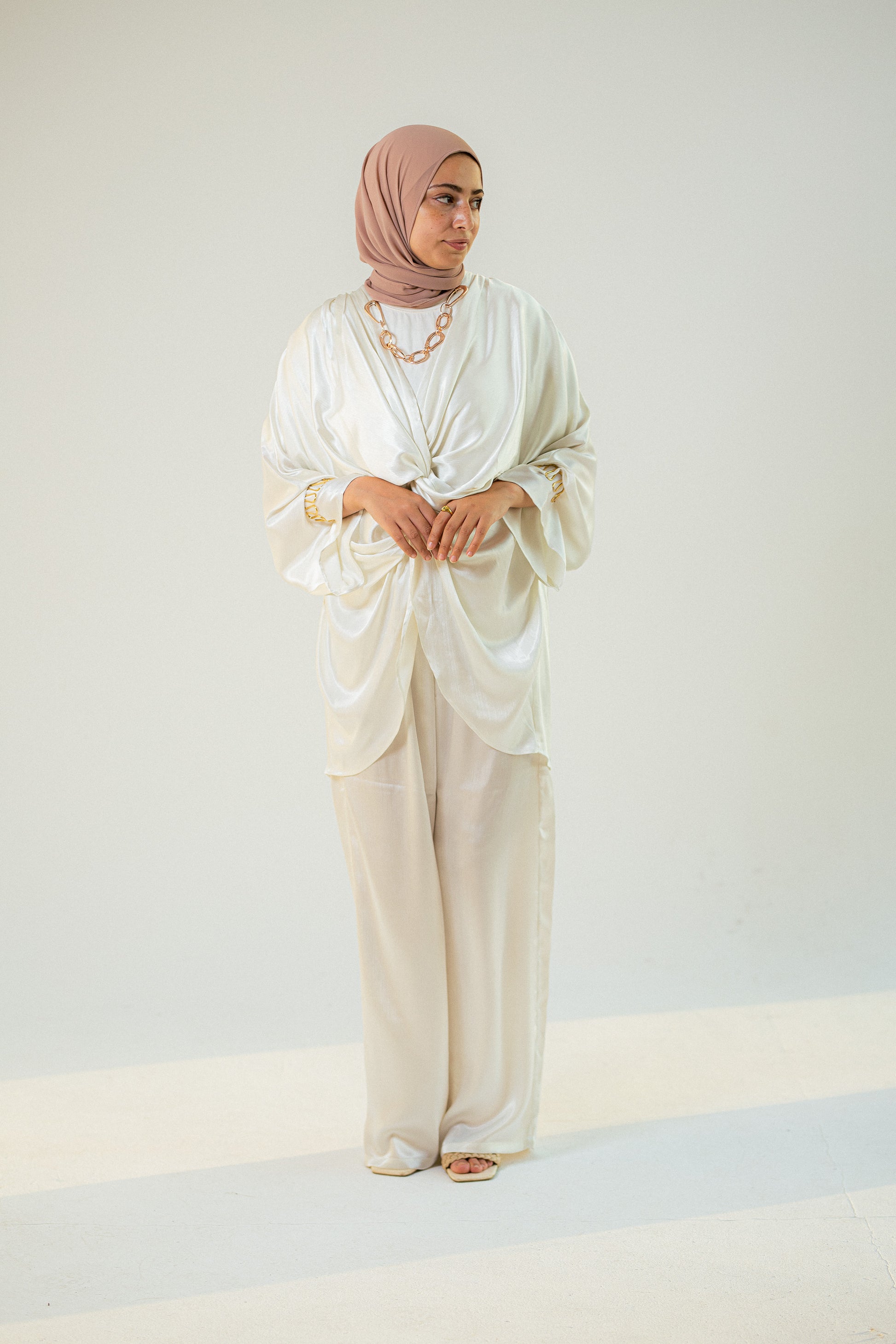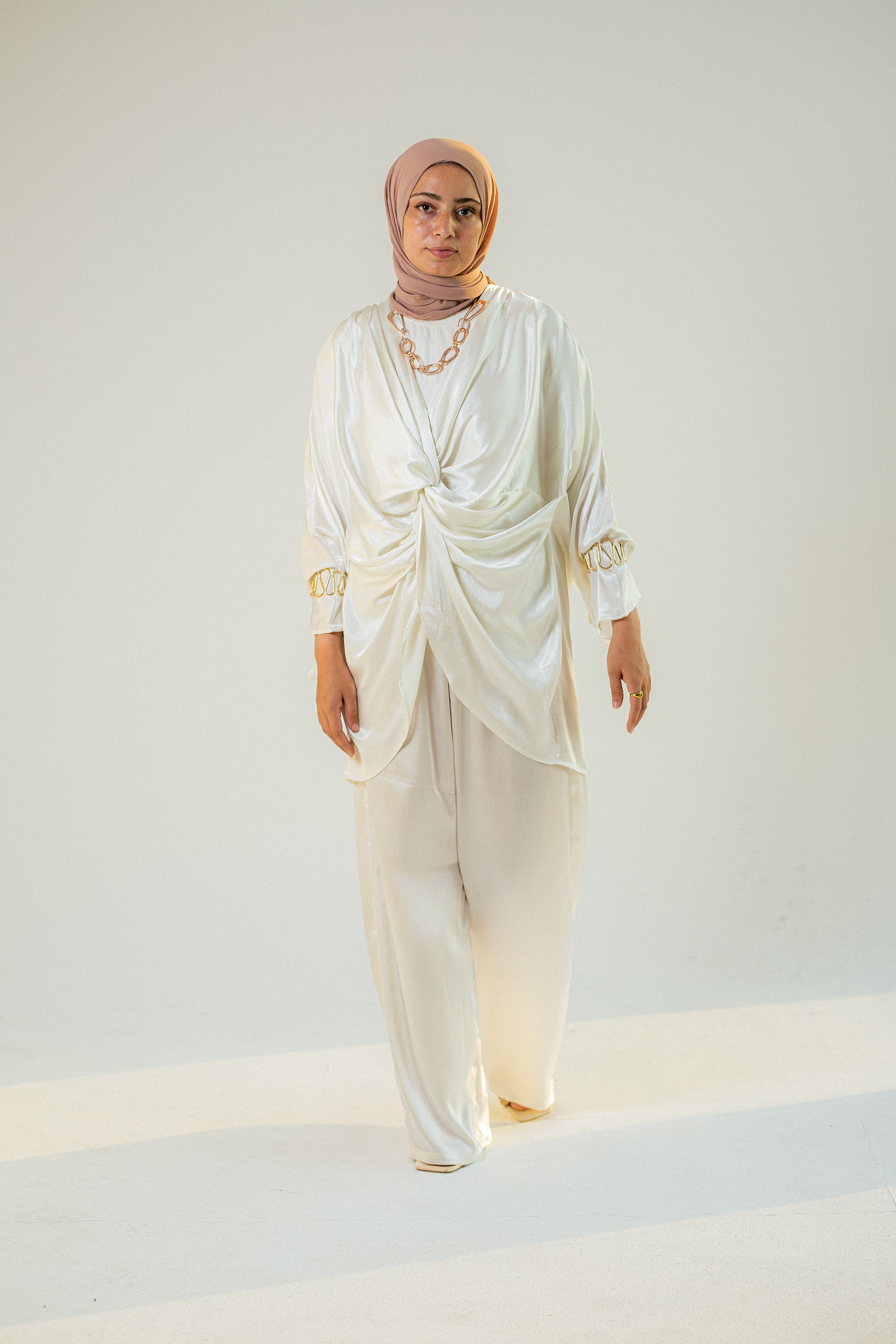 Here’s a chic and polished name + description for your satin set (knot top + wide leg pants) that will work beautifully on your website: