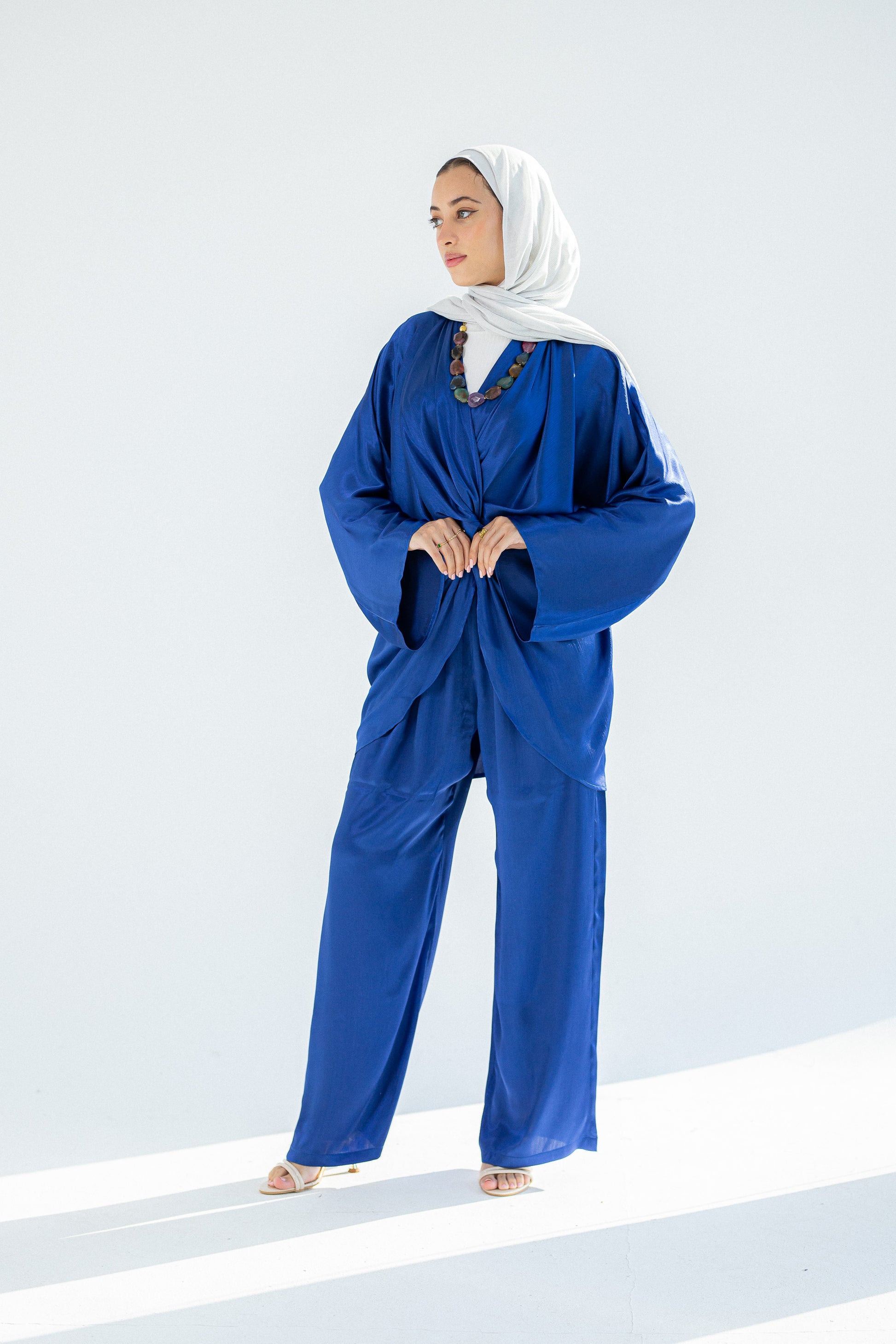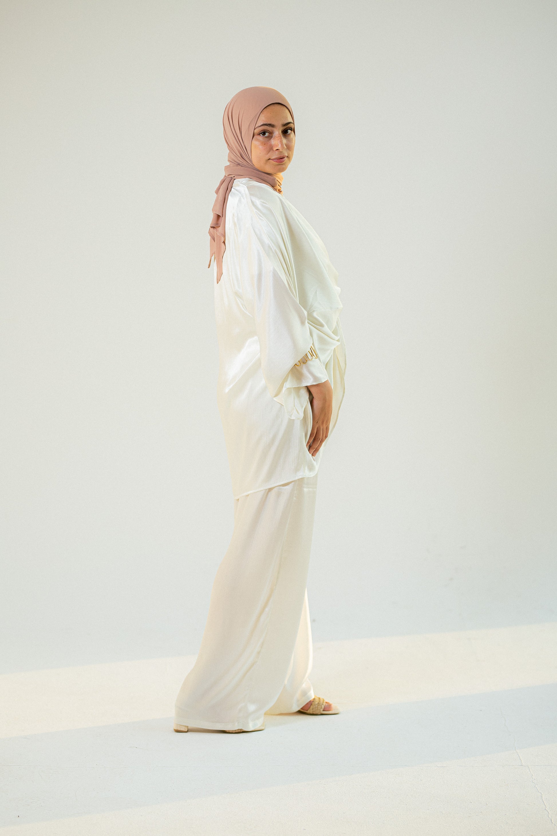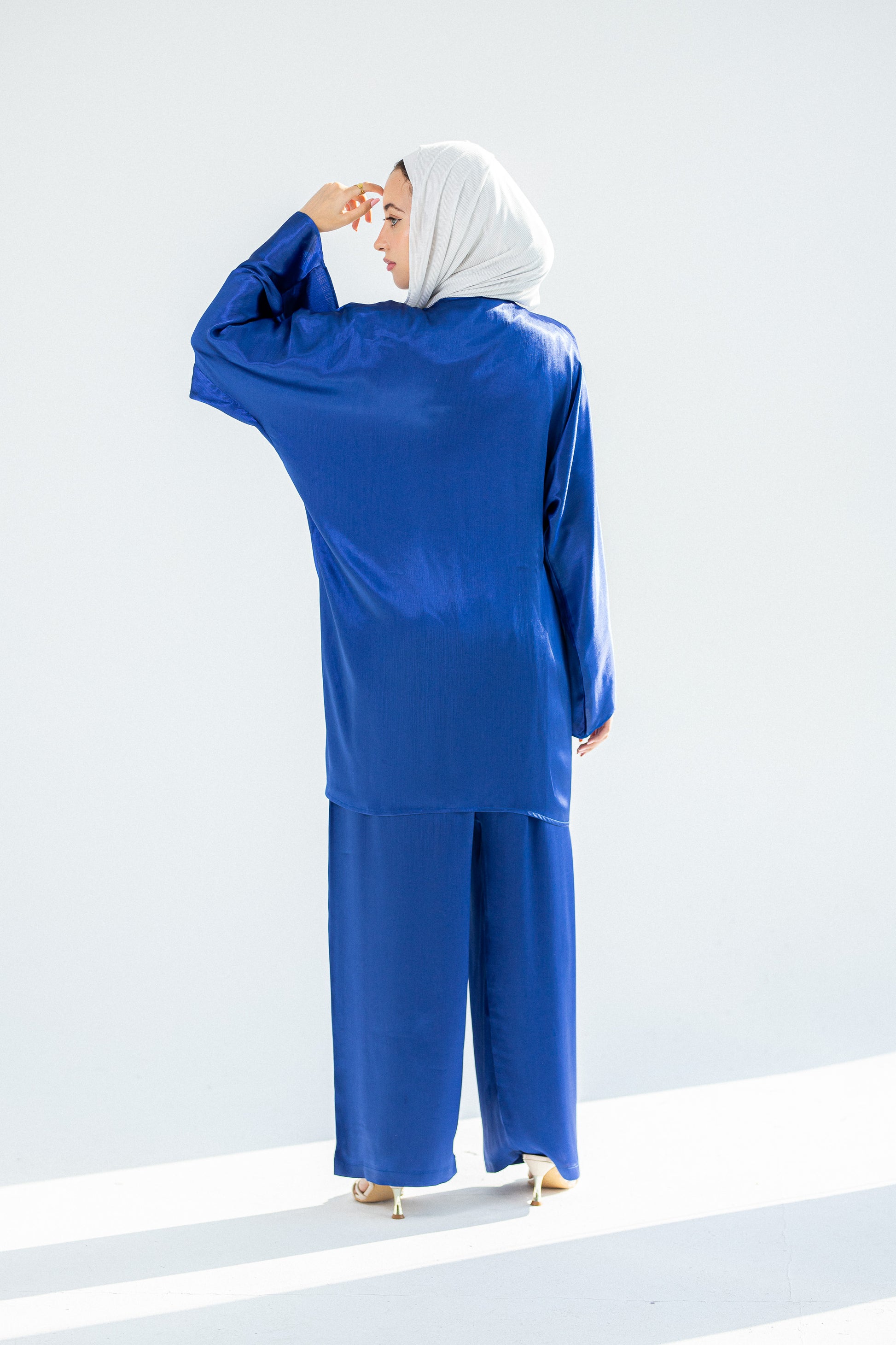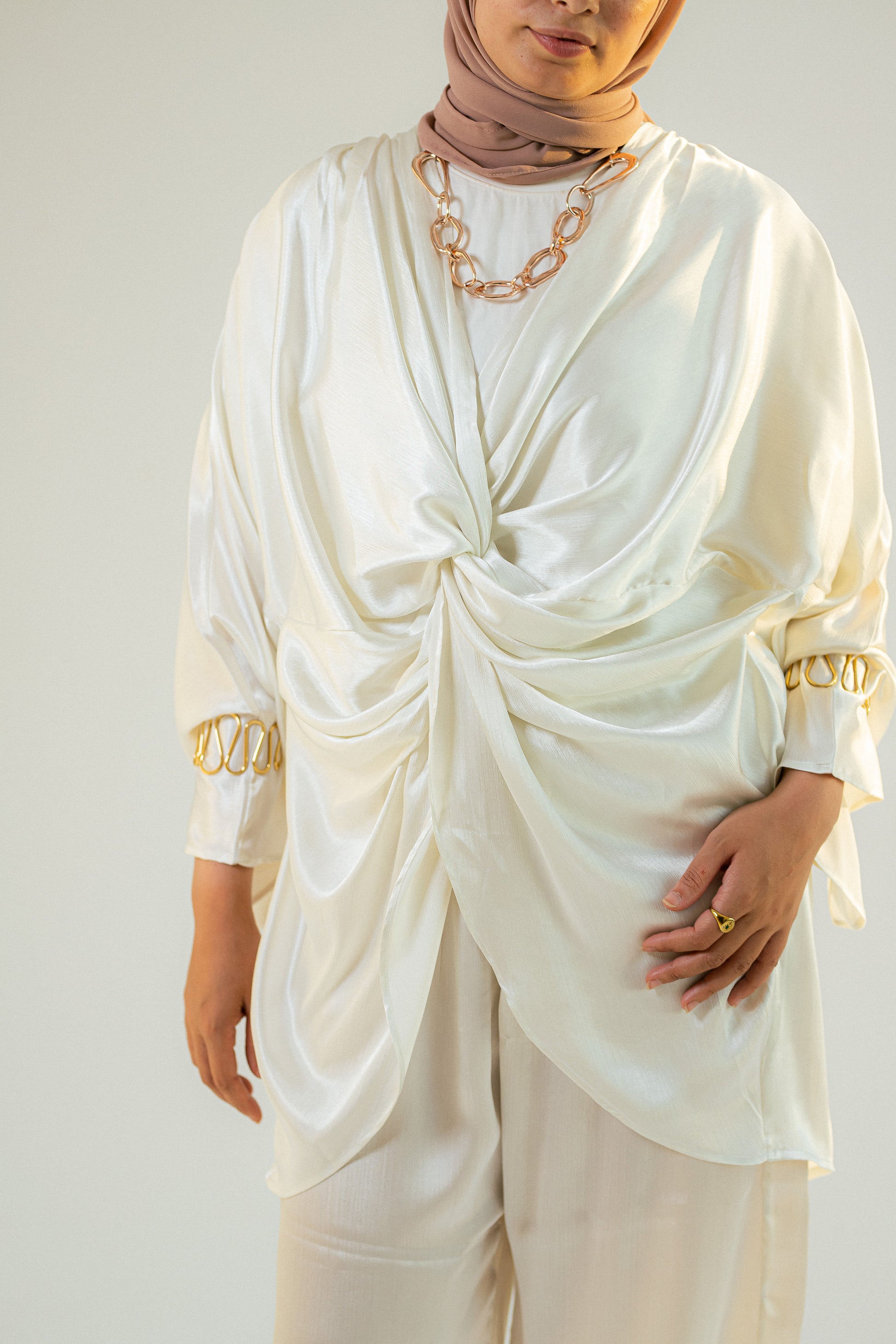 Here’s a chic and polished name + description for your satin set (knot top + wide leg pants) that will work beautifully on your website: