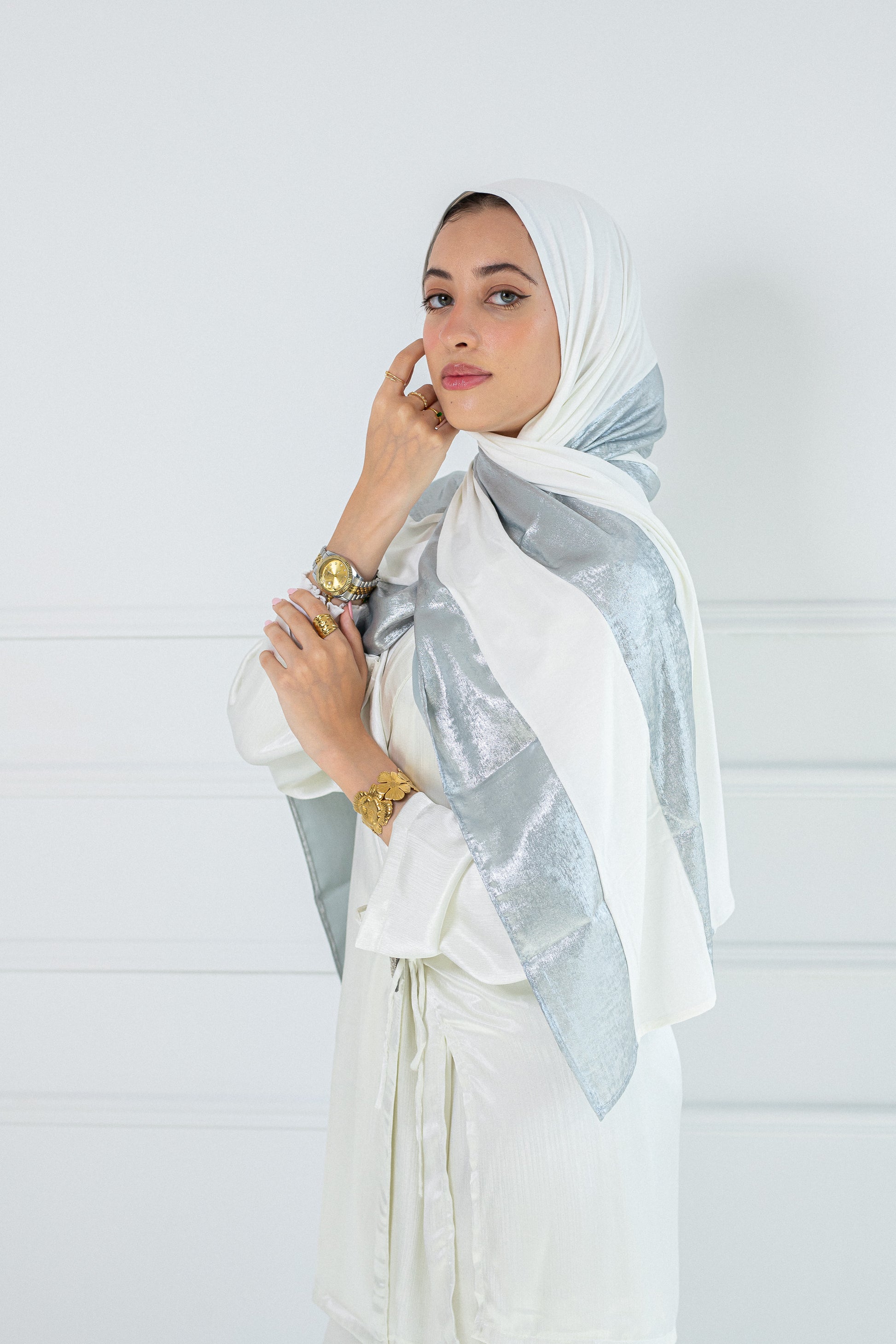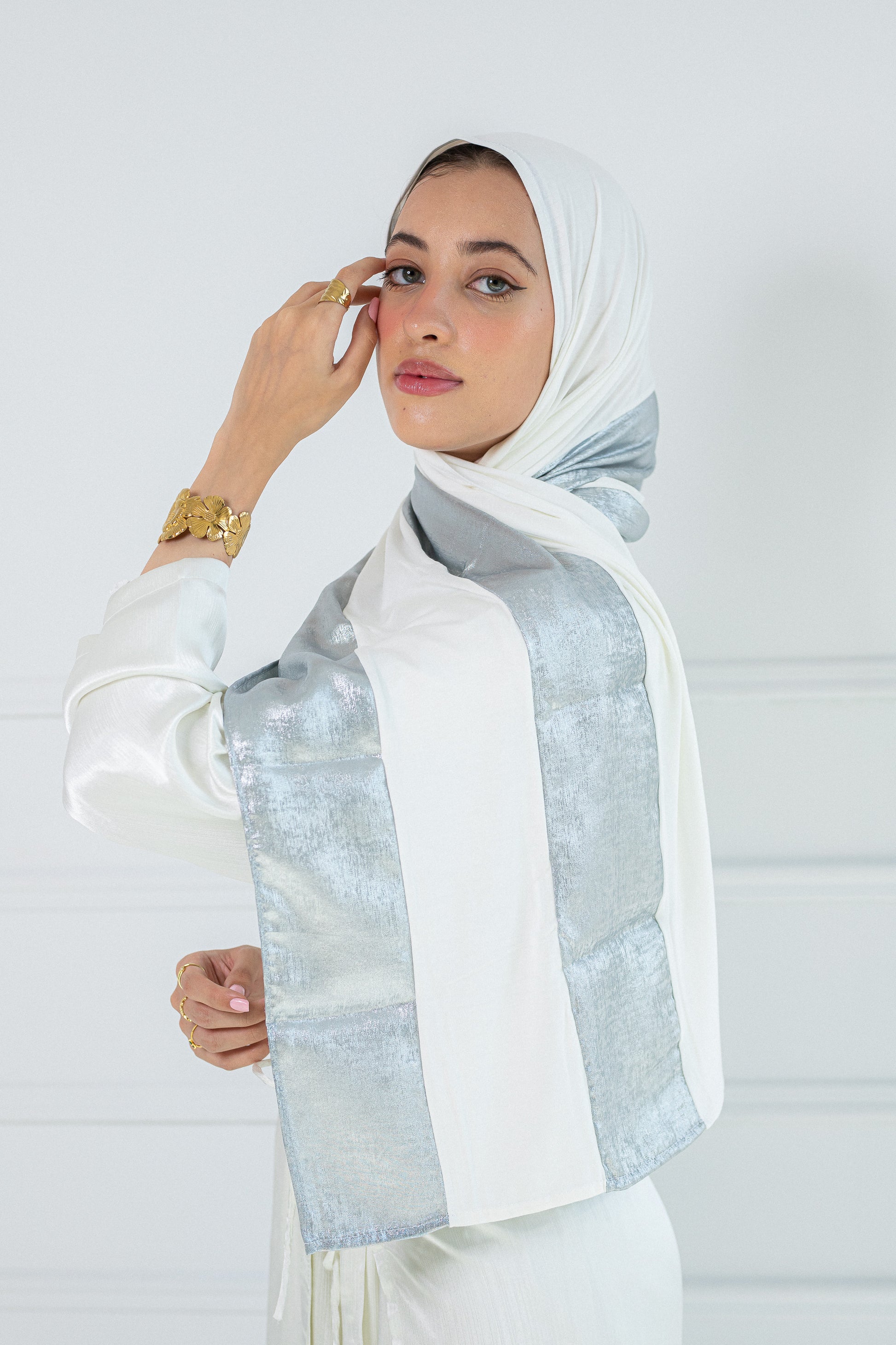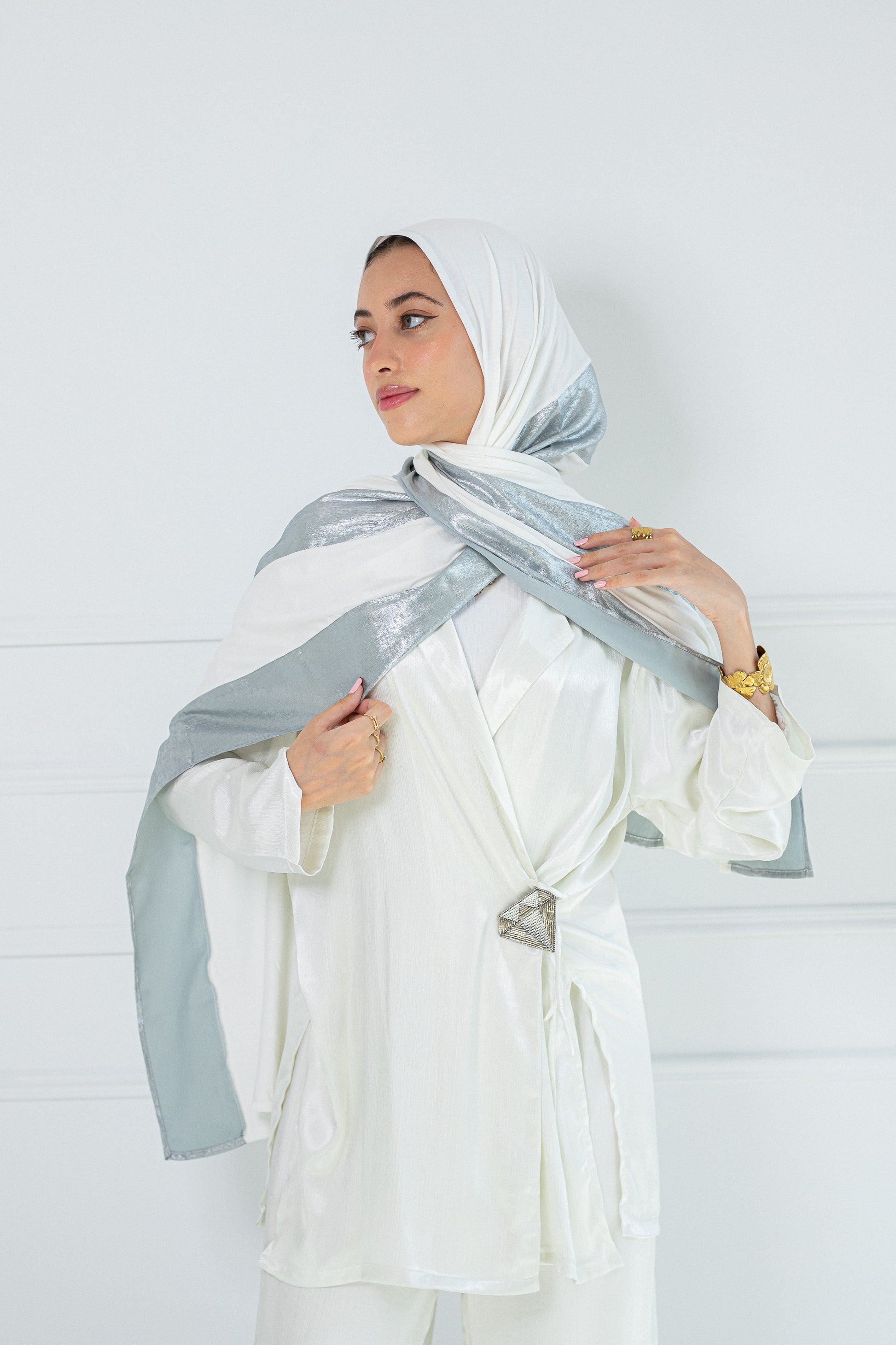 This light bluish silver scarf in soft cotton lycra is your go-to for subtle shine and all-day comfort.