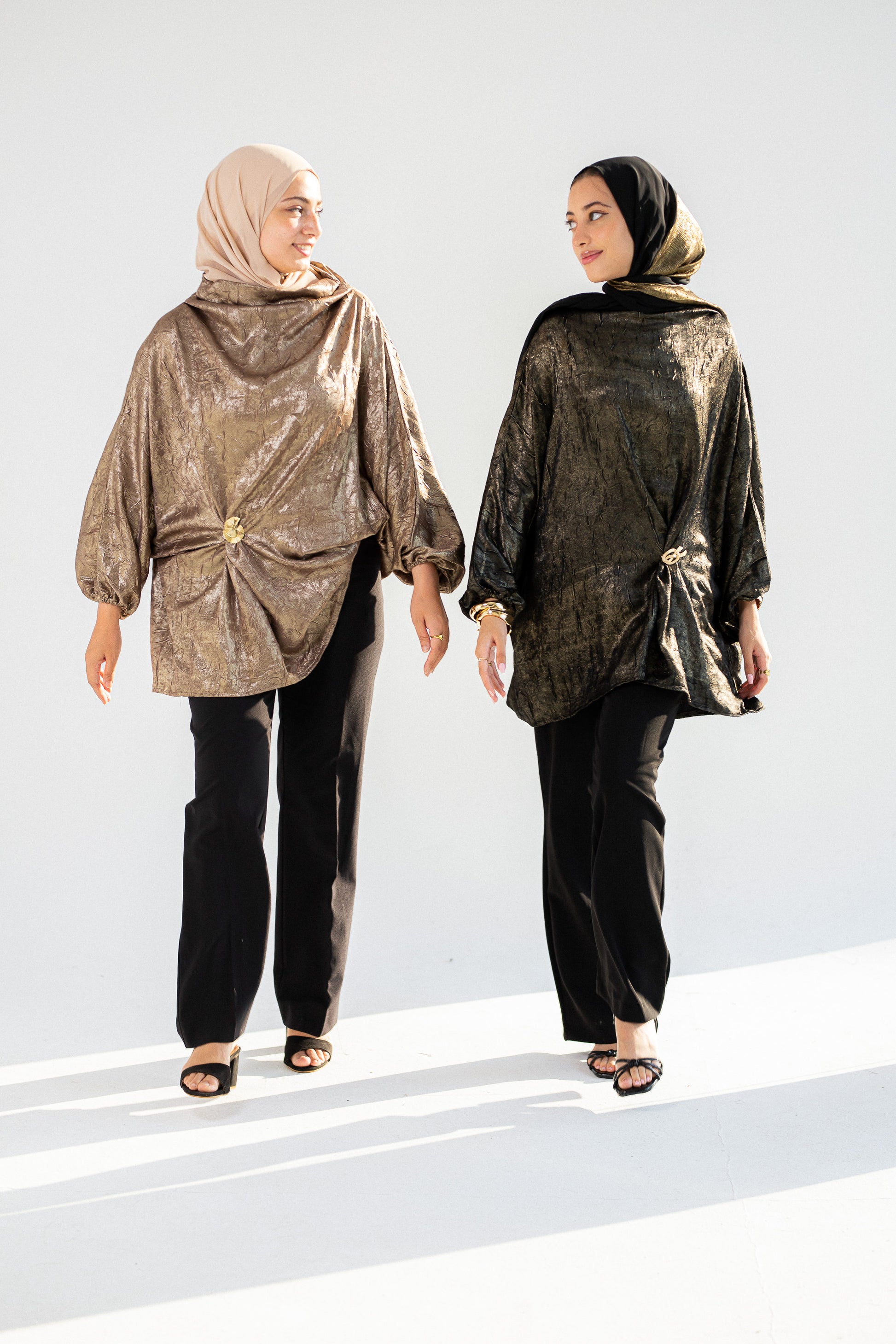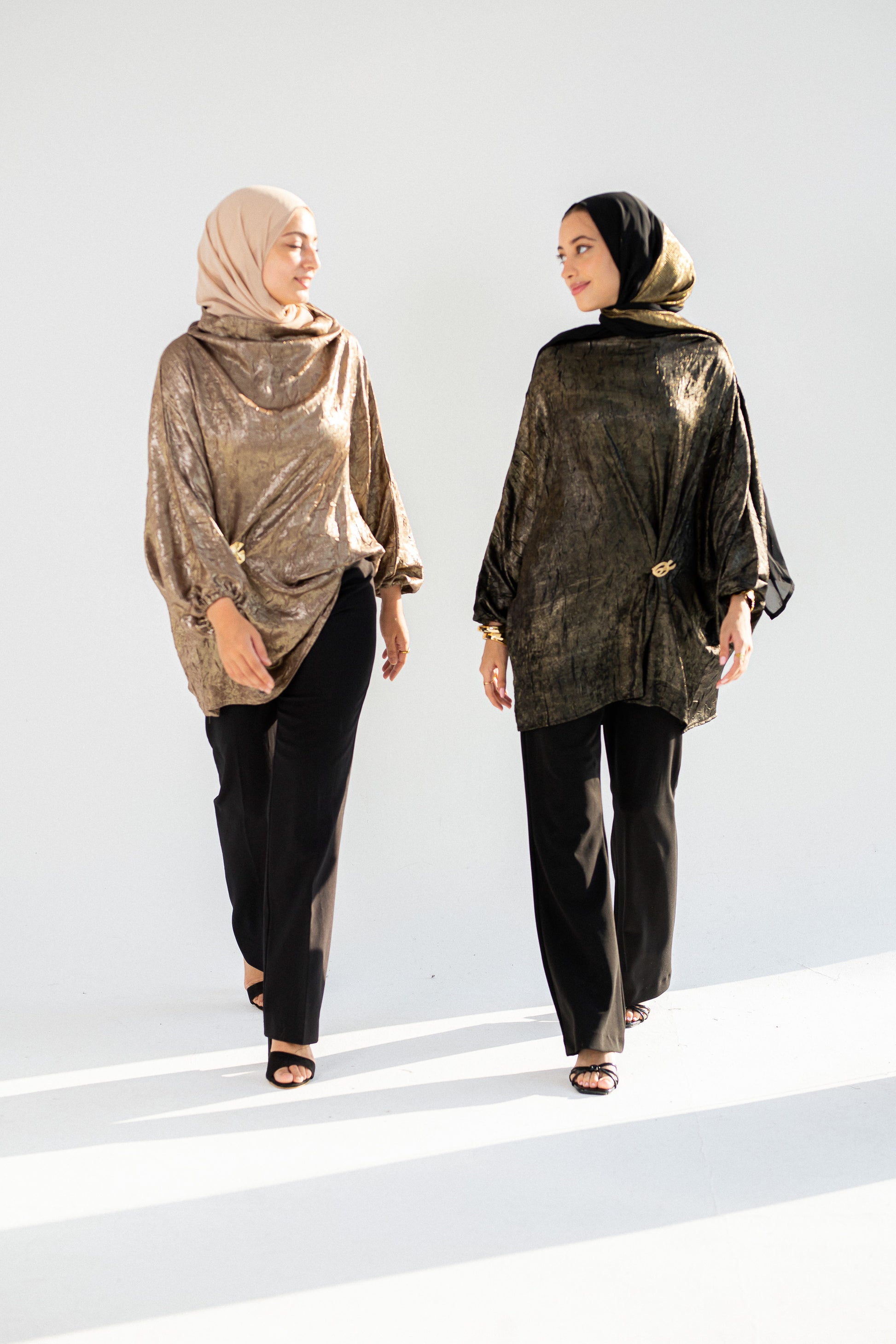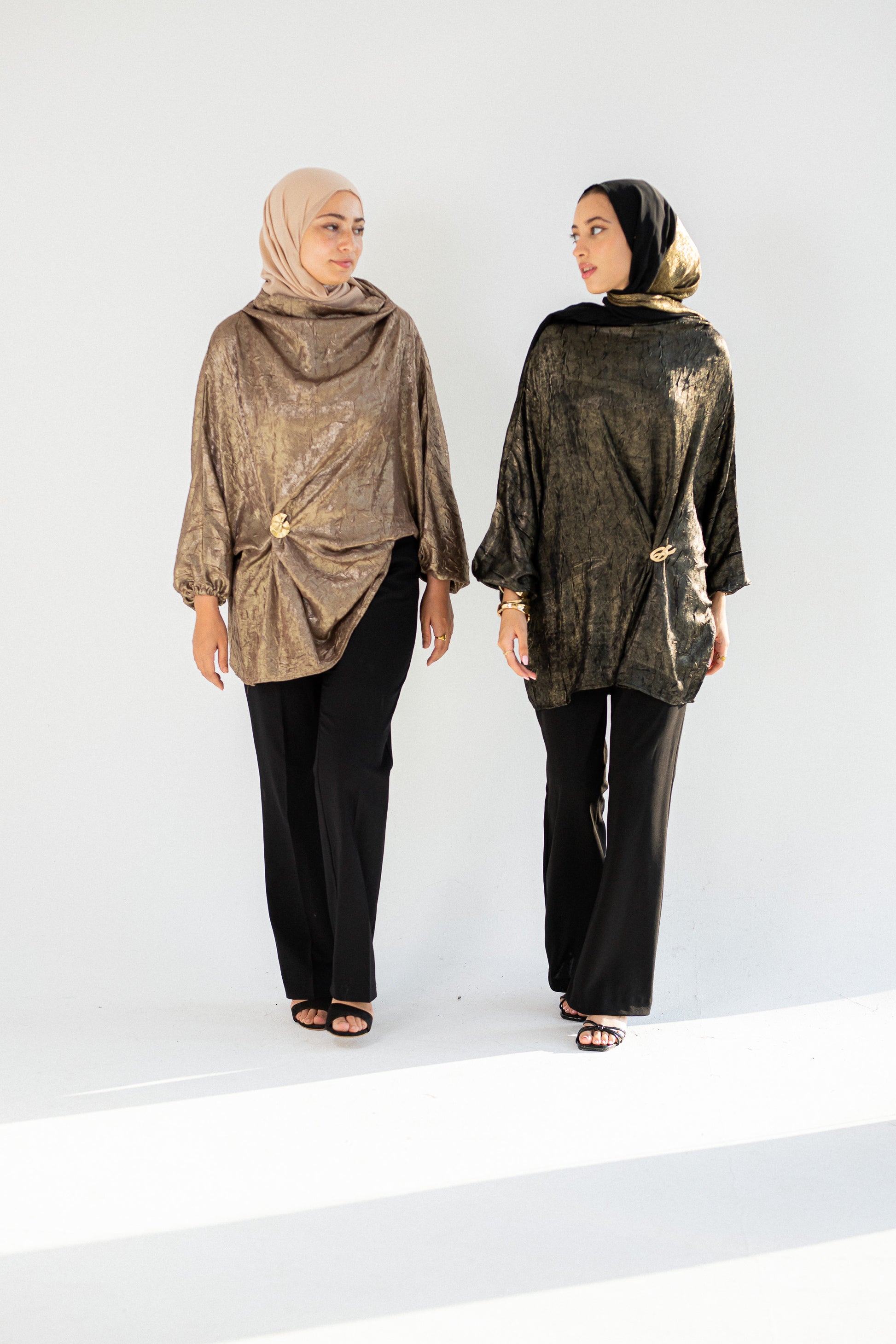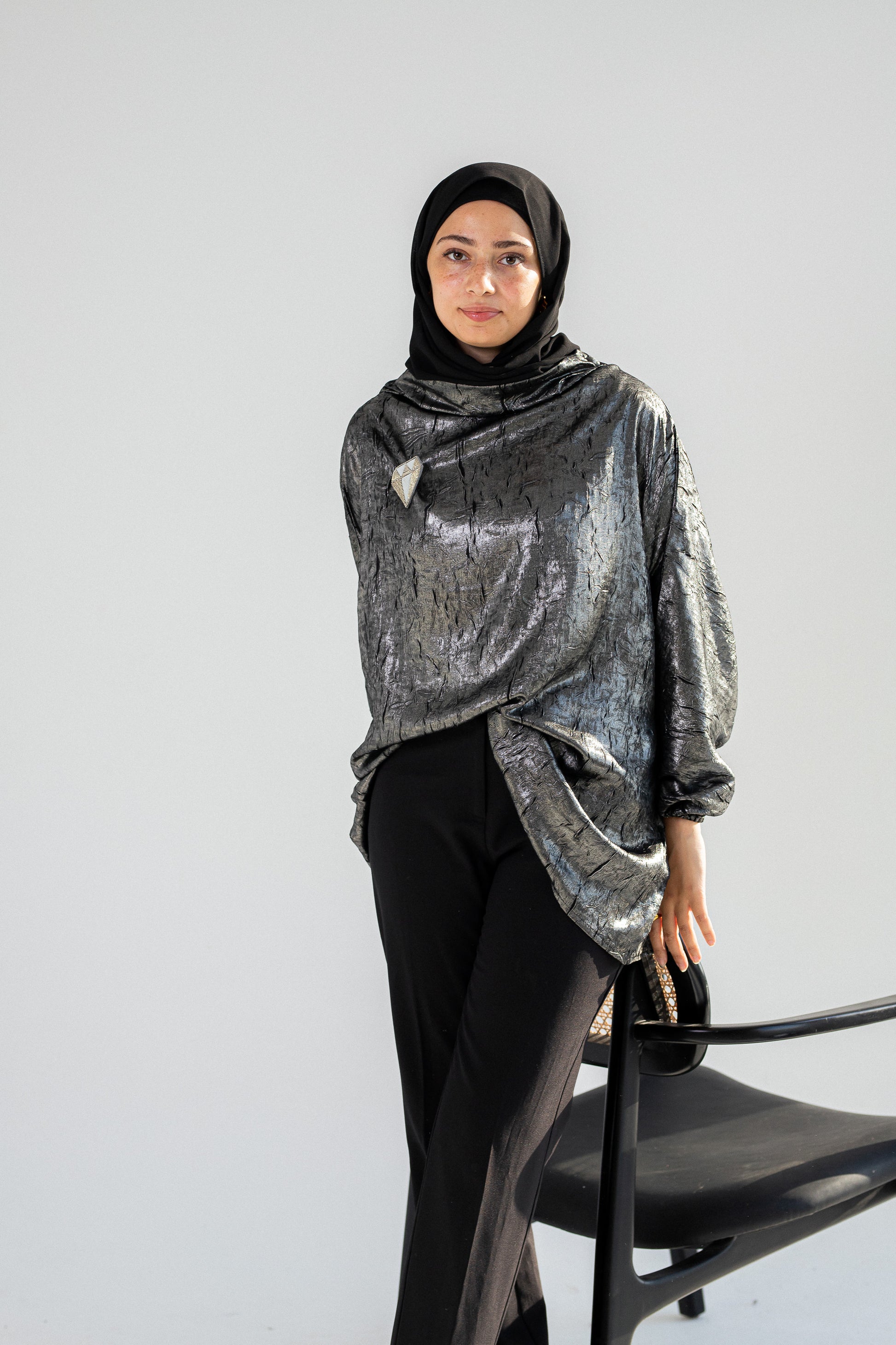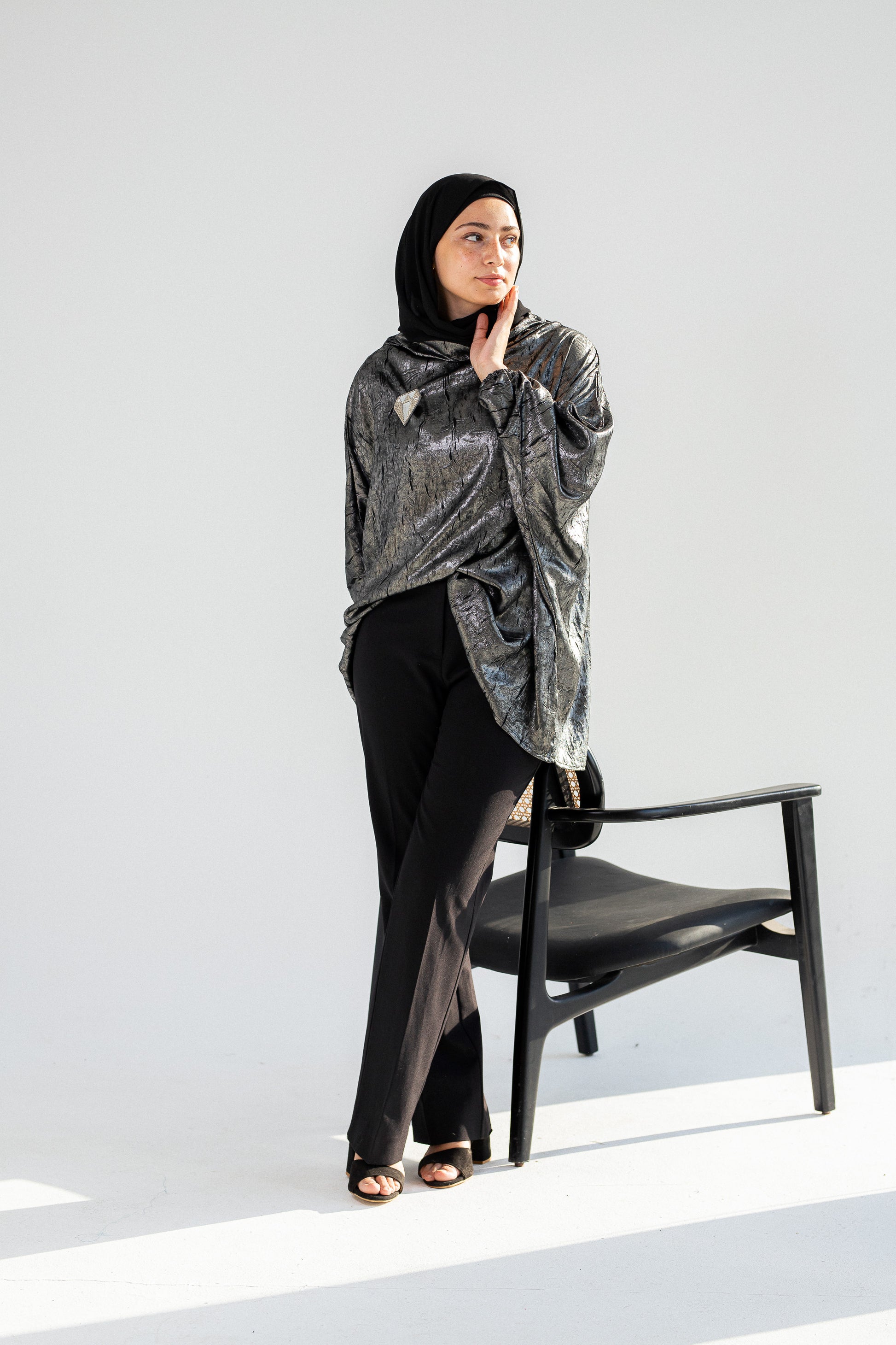 "When comfort meets couture — introducing Velure Flow, the oversized top reimagined. Designed with a lustrous, high-end fabric that catches the light and flows with grace, this piece brings effortless luxury to any event. Whether styled with tailored pants or a sleek skirt, it elevates your presence without trying too hard.